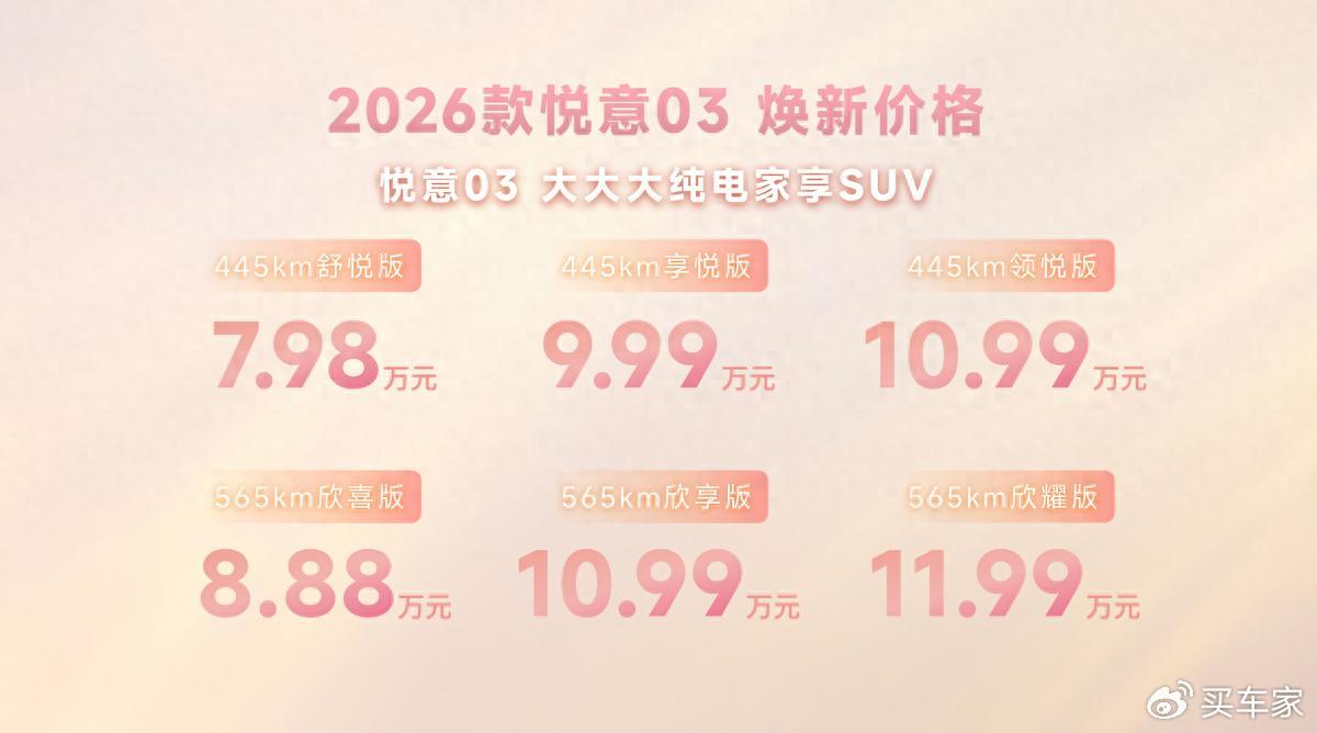 2026款悦意03上市:定位“大大大纯电家享SUV”,售价7.98万元起发表时间:2026年03月09日 来源:新浪汽车