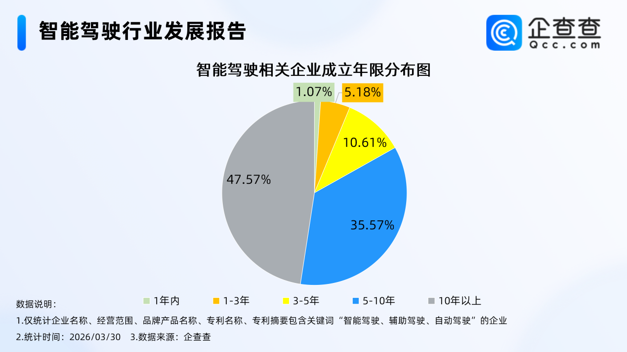 产品核心设计 此次推出的新产品以现有新能源商业车险体系为基础,遵循“总体稳定、部分优化”的核心原则,重点覆盖消费者与汽车企业普遍关注的智能驾驶特定场景、车辆软硬件损失等风险保障需求,可实现对L2至L4全级别智能网联新能源汽车的统一适配。 保费定价机制 在保费定价方面,新产品价格与现有新能源车险相比整体保持稳定,仅会根据保障责任的增减变化进行适度调整。相关方明确,后续随着行业运营数据的持续积累、智能驾驶技术的不断迭代,汽车企业的智驾技术能力等相关指标,也将被纳入保险定价体系进行统一考量。 行业数据背景 企查查数据显示,当前国内现存智能驾驶相关企业共计7,982家。2025年全年国内新增注册智能驾驶相关企业107家。经营年限分布上,成立10年以上的企业占比47.57%,成立5-10年的企业占比35.57%,两个区间合计占比超过83%,行业主体技术积淀特征显著。 行业属性方面,智能驾驶相关企业呈现明显的资金密集型特征,注册资本5000万元及以上的企业占比43.19%,为所有注册资本区间中占比最高的类别。区域分布上,华东地区相关企业数量位居全国首位,占比达43.99%。