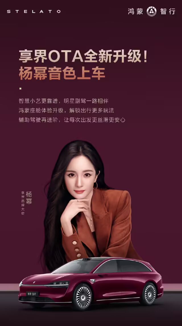 杨幂与享界的渊源 杨幂早在2024年就成为了享界车主。在2024年8月19日举行的享界S9上海首批用户交付仪式上,华为常务董事余承东亲临现场为车主交车,杨幂作为此次交付的001号车主来到现场。2025年10月,享界汽车曾宣布沈腾和杨幂成为享界品牌大使。享界车型后续还OTA升级了车载语音助手小艺,支持杨幂音色。 此外,杨幂一直是华为的忠实用户,除了汽车之外,还一直在用华为手机,包括Mate X5、Mate XT三折叠、Pura X阔折叠等热门机型。此前,华为Mate XT发布前的杨幂预告片“横竖都好用”曾一度爆火出圈。